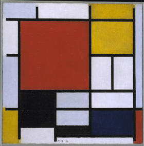 Parigi è diventata cubista e Mondrian, che è artista di pensiero oltre che di tavolozza, lo studia ed esplora attraverso articoli di giornale e le lettere degli amici pittori. Nel 1911 il Cubismo approda ad Amsterdam, dove Mondrian e Toroop espongono accanto a Cézanne, Braque e Picasso: poco dopo Mondrian lascia l’Olanda e si trasferisce in Francia, dove in breve trova la sua strada bidimensionale. Nella sintesi estrema che cercano nella raffigurazione, i Cubisti scompongono i soggetti fino a renderli per piani tridimensionali, spigoli e profondità; Mondrian va oltre e rinuncia alla terza dimensione, traccia linee orizzontali e verticali, usa il colore per rendere lo spazio. Il suo primo quadro astratto è del 1913: quattro anni dopo Mondrian fonda il Neoplasticismo, traduzione teorica delle sue tele e manifesto dell’arte futura, destinata – diceva – a far vedere e sentire bellezza, bontà, verità, l’equilibrio universale. Astrazione pura, concetti, idee; colori, linee, piani. La sfida più grande di Mondrian è creare un mondo modulare ma mai ripetitivo, dove anche la minima variazione è dotata di senso e viene percepita: il grigio che sfuma il bianco puro, le variazioni nello spessore della linea e nella lunghezza, il rapporto mutevole e sempre bilanciato tra superfici di diverso colore, la posizione dei campi cromatici, la loro iterazione. Linee e riquadri bidimensionali non riescono a risultare piatti, grazie al ritmo che Mondrian vi instilla a costo di rifacimenti e lentissime elaborazioni: sfida vinta.