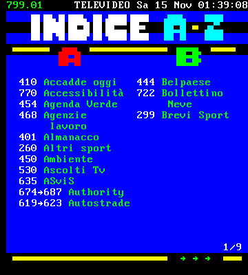 201 Calcio 466 Concorsi 229 Calcio brevi 160 Culture 760 Canone TV 419 Curiosità 596-597 Capitale dal mondo della Cultura 405-406 Che tempo fa 567 Cinema 170 Cittadini 481-482 CNR 800 Commerciale 583 Concerti > > >