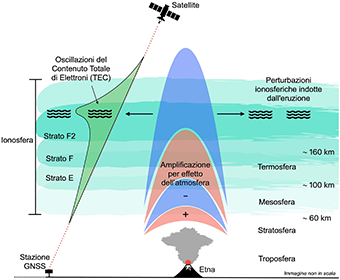 Figura 1: Immagine che rappresenta il fenomeno studiato. L’eruzione esplosiva rilascia energia in atmosfera sotto forma di onde gravito-acustiche che, amplificandosi verso l’alto, possono raggiungere la ionosfera determinando variazioni del suo contenuto di elettroni. Tali variazioni elettroniche vengono registrate dai segnali satellitari acquisiti in continuo dalla rete di ricevitori al suolo.