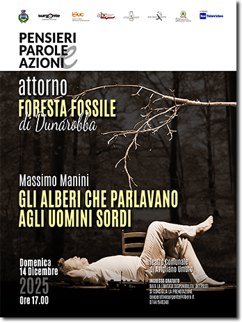 A conclusione della lunga kermesse di eventi “Pensieri, parole e azioni attorno alla Foresta Fossile di Dunarobba”, lo spettacolo scritto e interpretato da Massimo Manini, ispirato alla storia dello stesso sito. Una favola dei nostri giorni adatta a qualsiasi pubblico: piccoli e grandi insieme. Il lavoro apprezzato anche in Francia, narra la storia un luogo “antico e magico” visto attraverso gli occhi di una piccola bambina e di un vecchio padrone di una cava.