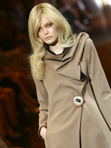 Giorgio Armani Privé. Sfila nell’Espace Vendôme, nell’omonima piazza che è “l’ombelico del mondo” della moda e il cui solo nome già evoca eleganza, raffinatezza, gusto. Le modelle , tutte rigidamente bionde, pelle diafana, algide e misteriose, incedono con passo regale e i loro colori si armonizzano alla perfezione con le sfumature dell’ambra su cui si gioca l’intera collezione, sia quando propone elegantissimi tailleur pantaloni, o abiti ricamati con paillettes per la sera. E’ il marrone, in tutte le sfumature, dal beige al bronzo scuro che domina, linee geometriche e rigorose e un minimalismo che ha sempre accompagnato il grande stilista italiano.