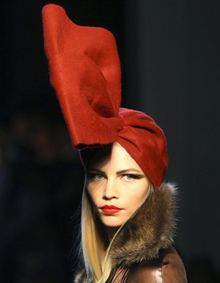 E ancora, la “femme fatale” di Jean Paul Gaultier. Le modelle indossano cappelli altissimi, che le rendono simili a caramelle. Anche le acconciature, molto elaborate, si sviluppano in verticale. Gli abiti sono sinuosi, a sirena, i colori brillanti: rosso, viola, nero e oro. Tanta seta, tanto chiffon, tanta pelle morbidissima. Si vede anche qualche guêpiére, e subito la donna- diva si ammanta di un fascino antico e un po’ demodé. (A proposito, sembra che questo indumento sarà rilanciato il prossimo inverno da alcuni brand dell’intimo femminile, forse più pensando agli uomini che alle donne moderne!).