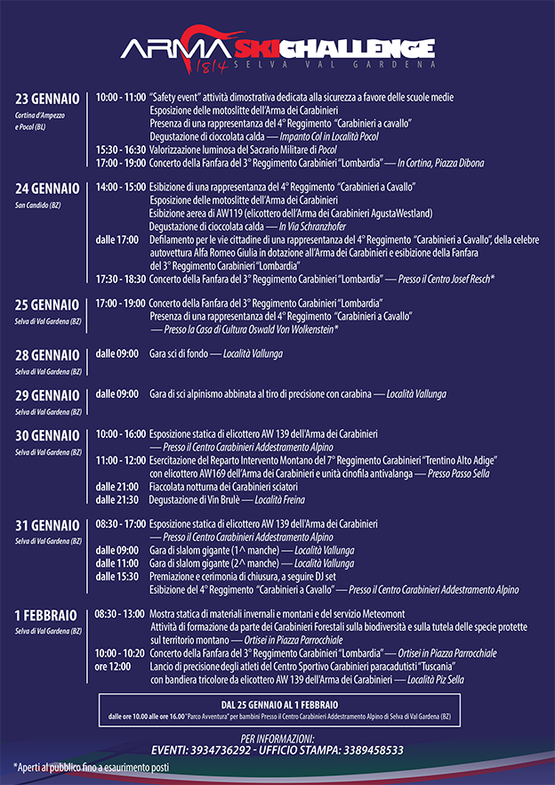 Oltre ad un importante momento di riflessione collettiva dedicato alla memoria dei Caduti della Grande Guerra con la valorizzazione luminosa del “Sacrario Militare” di Pocol, il 23 gennaio alle 15.30, Arma 1814 Ski Challenge prevede un ricco palinsesto di eventi aperti al pubblico che coinvolgono numerosi assetti dell’Arma dei Carabinieri come la Fanfara del 3° Reggimento Carabinieri “Lombardia” - che si esibisce per le vie cittadine di Cortina e in tre concerti a San Candido, Selva di Val Gardena e Ortisei - e una rappresentanza del 4° Reggimento Carabinieri a cavallo. In calendario anche l’esibizione aerea dell’elicottero AW 139, mostre statiche di mezzi in dotazione all’Arma con la celebre autoradio Alfa Romeo Giulia, eventi di formazione con i giovani alunni della Scuola Primaria Duca d’Aosta e della Scuola Media Zardini dell’Istituto Comprensivo di Cortina d’Ampezzo, approfondimenti da parte dei Carabinieri Forestali, per trasmettere i valori istituzionali, ambientali e sportivi che contraddistinguono l'operato dell’Arma e promuovere la cultura della Difesa e della sicurezza in ambiente montano. Inoltre, dal 25 gennaio al 01 febbraio i più piccoli sono attesi con giochi e intrattenimento al “Parco Avventura” presso il Centro Carabinieri Addestramento Alpino.