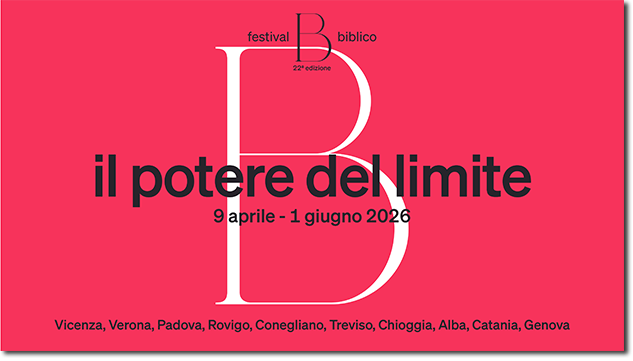 Dal 10 aprile al 1°giugno le città di Vicenza, Verona, Padova, Rovigo, Conegliano, Treviso, Chioggia, Alba, Catania e Genova ospitano la 22ª edizione del Festival Biblico che quest’anno con il titolo “Il potere del limite” si propone di intercettare una delle questioni più urgenti del nostro tempo, quella di una società che percepisce il limite come un ostacolo da superare e che tende sempre più a interpretare il potere come uso unilaterale della forza. La manifestazione, invece, vuole proporre uno sguardo diverso cercando di mettere in relazione il messaggio biblico con quanto oggi accade nel mondo, ai rischi del dilagare smisurato del potere e ai vari tentativi di rimuovere il limite dalle nostre vite - come fosse soltanto qualcosa di depressivo (se non di oppressivo).